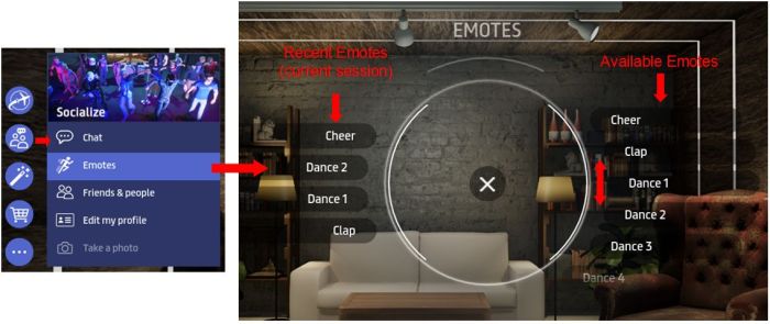 Emotes are selected from the right of the menu, by scrolling up / down through them and clicking on the desired option. Recent emotes (if displayed) are accessed the same way. For VR users, an added bonus is that moving your head or arms will no longer cancel a playing emote (just walk forward, as per Desktop mode).