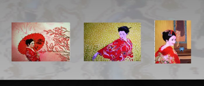 Much of this is in evidence in the 15 pieces displayed at La Maison d’Aneli, in the midst of which are, to my eyes, three absorbing painting of Geishas which exhibit a unique and eye-catching style that focuses the attention marvellously, encouraging the observer to work outwards from them and take in the rest of the paintings in turn.