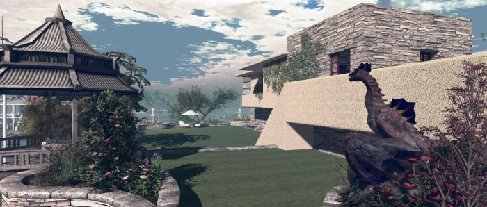 As the parcel holding Isla Pey is rather long and slender, and given we already had a “north” and “south” end, linked by a large pond, stream and waterfall, cutting the land in two was easy enough. Out went the water, the falls and the surrounding mesh landforms creating the basic landmass was created. Then, by swinging the house around and moving it southwards, there was room to add a fair-sized back garden – the landscaping made easier (again) by the re-use of the lawn design from the “old” island design.
