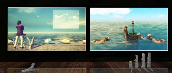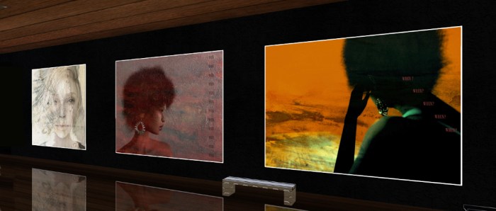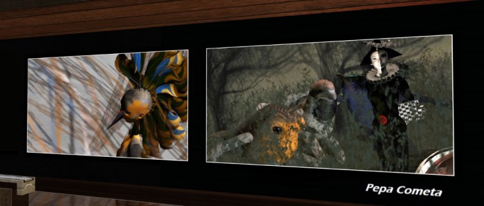 Facing Duna’s pieces are four untitled (at least in terms of their mounting) pieces by Pepa. Primarily avatar studies (there is perhaps a hint of mixed media in one), and are a n interesting mix that again play on emotions – albeit this time the emotions of the visitor. Are they indicative of happiness and / or gaiety, as suggested by the almost Hareliquinesque dress of one and the carnival-like mask of its neighbour? Or are they perhaps expressive of something else?