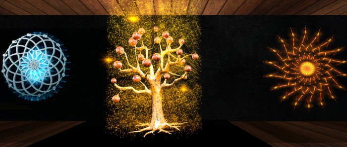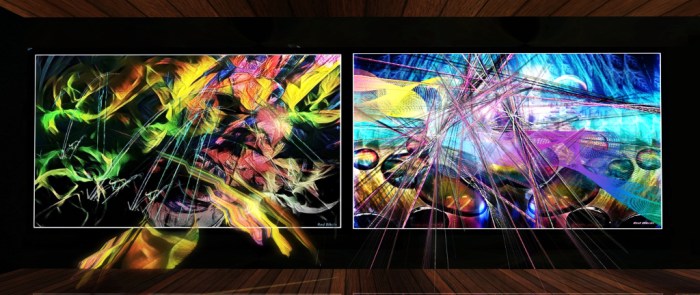 Redi’s presentation also feature motion and combine 2D and 3D elements in three pieces of richly colourful abstract art, all of which can be quite mesmerising as the eye is drawn into their loops, lines, swirls and patterns.