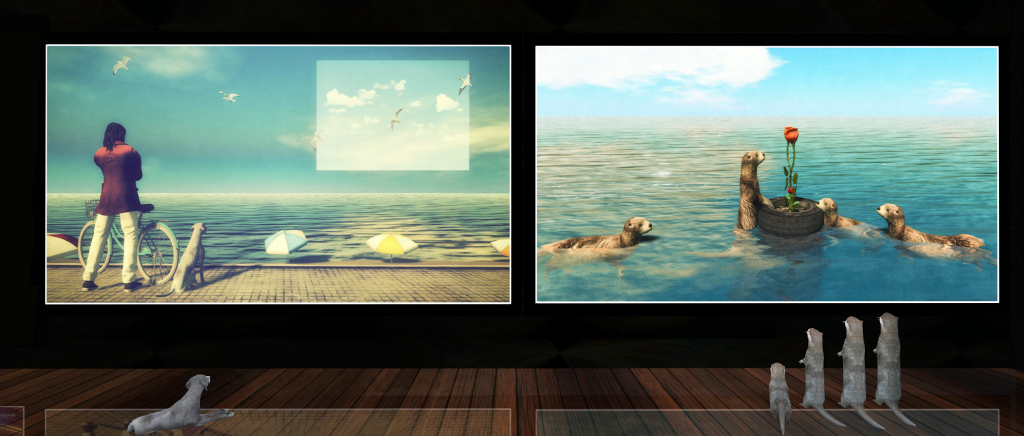Facing Duna’s pieces are four untitled (at least in terms of their mounting) pieces by Pepa. Primarily avatar studies (there is perhaps a hint of mixed media in one), and are a n interesting mix that again play on emotions – albeit this time the emotions of the visitor. Are they indicative of happiness and / or gaiety, as suggested by the almost Hareliquinesque dress of one and the carnival-like mask of its neighbour? Or are they perhaps expressive of something else?