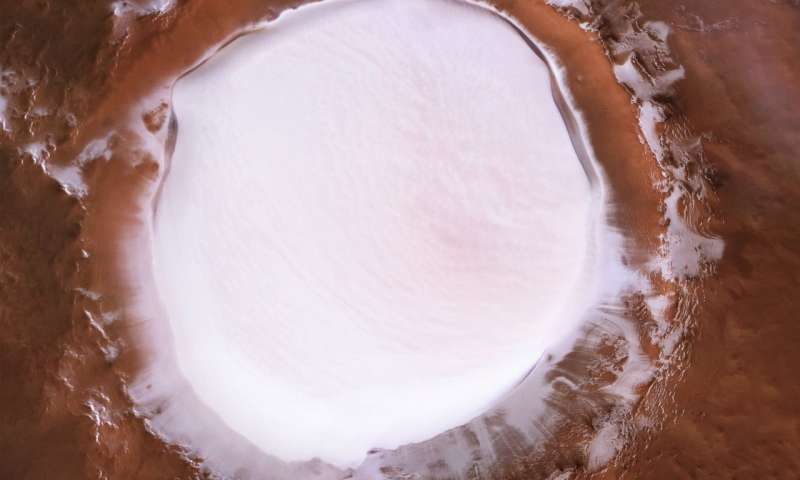 On December 21st, 2018, the European Space Agency released stunning images taken of the surface of Mars by the Mars Express orbiter. It shows a veritable winter wonderland, a crater seemingly filled with ice and snow.