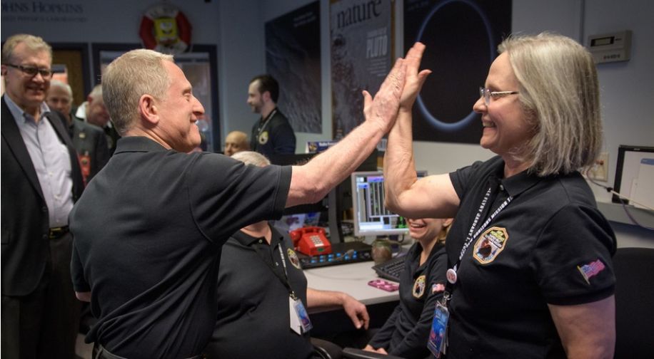 Alan Stern, the principal investigator for New Horizons, high-fives Alice Bowman, the mission operations manager at JHU APL, after controllers received a transmission from the spacecraft confirming a successful fly-by of Ultima Thule on January 1st, 2019. Credit: NASA / Bill Ingalls