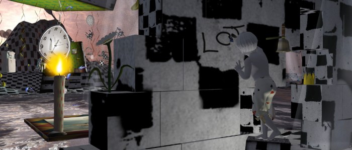 A still from Empty, the 9th video in Erik Mondrian’s [MFA] Thesis video series, filmed in Second LifeErik Mondrian is a writer, artist, and scholar who makes work about place, belonging, love, longing, and madness. He holds an MA in Mass Communication & Media Studies from San Diego State University, focusing on virtual worlds as new media, and is close to graduating with Interschool Master of Fine Arts (MFA) in Voice Arts & Creative Writing and supplemental concentration in Integrated Media from California Institute of the Arts.