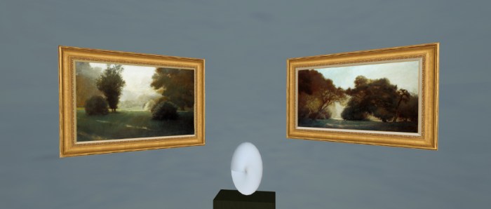 The building has a pleasant open plan look with high ceilings featuring a glass archway skylight, and space for a galleried upper level, all of which allows plenty of ambient light within the design. The lower level is divided into three areas. To the left on entering from the landing point give above, are two paintings from a series entitled Threatened Landscapes, and which show two tranquil country settings, either of which could have been painted as much in Second Life as in the physical world. A sculpture by region holder Transparent Banshee sits directly before the paintings, and a further sculpture (by Wolk Writer) can be found in the grounds of the gallery.