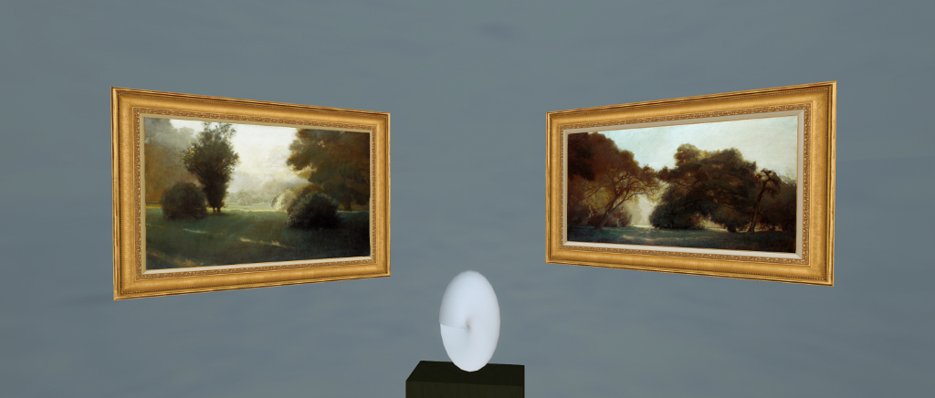 The building has a pleasant open plan look with high ceilings featuring a glass archway skylight, and space for a galleried upper level, all of which allows plenty of ambient light within the design. The lower level is divided into three areas. To the left on entering from the landing point give above, are two paintings from a series entitled Threatened Landscapes, and which show two tranquil country settings, either of which could have been painted as much in Second Life as in the physical world. A sculpture by region holder Transparent Banshee sits directly before the paintings, and a further sculpture (by Wolk Writer) can be found in the grounds of the gallery.