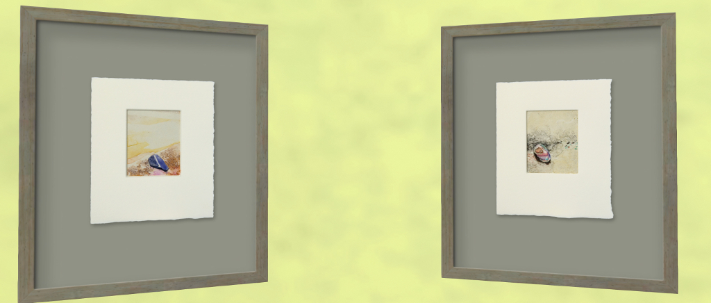 Split between the lower and upper levels are two displays of monotype images. As the gallery notes state, these are one-off prints created by applying paint of ink to a suitable surface – glass, metal, plastic – then transferring the image to paper via printing press.