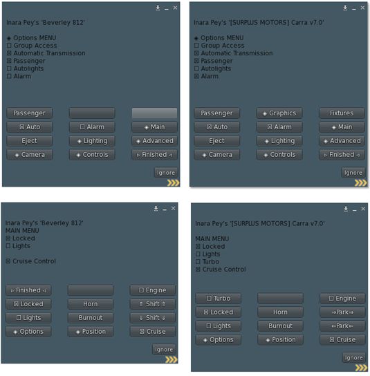 [SURPLUS MOTORS] CarraBoth cars have opening doors, bonnets and boots. The latter respectively reveal the engines, with the Beverley very much the superior. They both have customisable license plates (scripted again for the Carra). Both also have a tendency to float when being driven, and this can be far more noticeable with the Carra when resized smaller.
