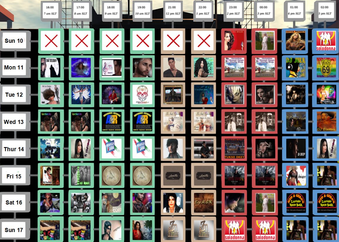 The event, which features a daily schedule of music running from 07:00 SLT through to 18:00 SLT, comprising a mix of live performances and DJ sessions lasting between one and three hours. A schedule board (seen above) is available at the event location.