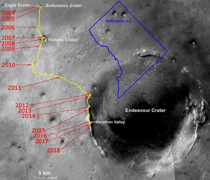 Designed to last just 90 Martian days and travel 1,000 metres (1,100 yards), the Mars Exploration Rover (REM) Opportunity vastly surpassed all expectations in its endurance, scientific value and longevity. In addition to exceeding its life expectancy by 60 times, it travelled more than 45 km (28 mi) by the time it reached its most appropriate final resting spot on Mars – Perseverance Valley.