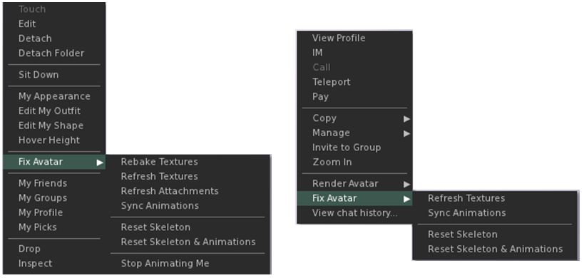 To view the menu, right-click on your own avatar or a nearby avatar and highlight Fix Avatar to open the sub-menu. This comprises: