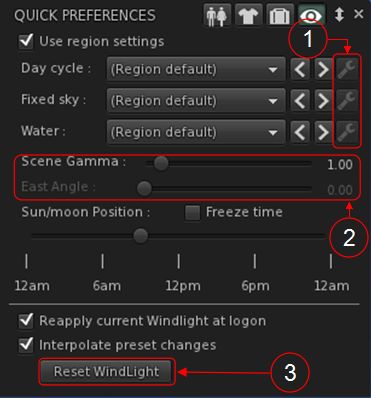 - A Reset Windlight button to revert to the default windlight (this button is also present on the Troubleshooting preferences tab).