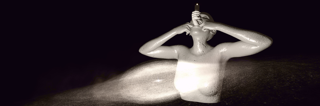 As you approach the hut, the light from within is revealed as a fire, burning brightly in the single room and consuming pages of manuscripts together with a shroud-like blanket. More candles light the way up the lighthouse and its single door. Inside lies the opportunity to listen to a recital of the poem, and contemplate the sculptures that sit within the lighthouse walls.