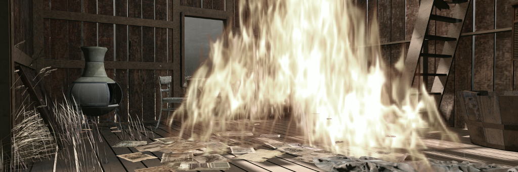 Thus, within the hut with have the fire and the burning of manuscripts, many of the pages painstakingly written and illustrated by hand. They represent the idea that a loss does not just impact the one or the few, but lessens the whole; in their burning, the pages are not just lost to whomever set them ablaze, but are lost also to all who might otherwise have read them. Similarly, the blanket with its edge caught within the flames might be taken as a death shroud, symbolising, Donne’s view that any mans death diminishes me, because I am involved in Mankinde