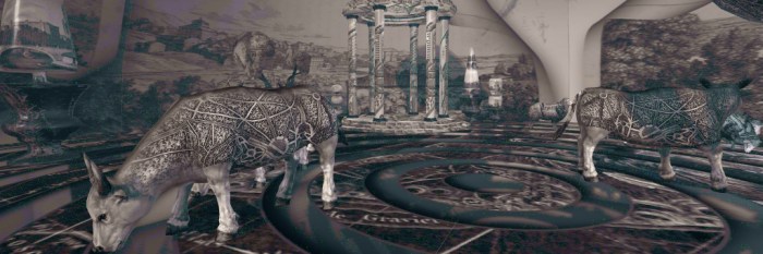 Getting around the builds is best achieved by walking / flying at ground level, and using the teleport cylinders that are scattered around to reach the sky builds (and which also connect to the ground-level areas). As with past builds this incorporates elements by Arcadia Asylum, which Alpha has re-textured and re-purposed to suit her design and which share the region with works by other Second Life creators.