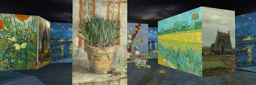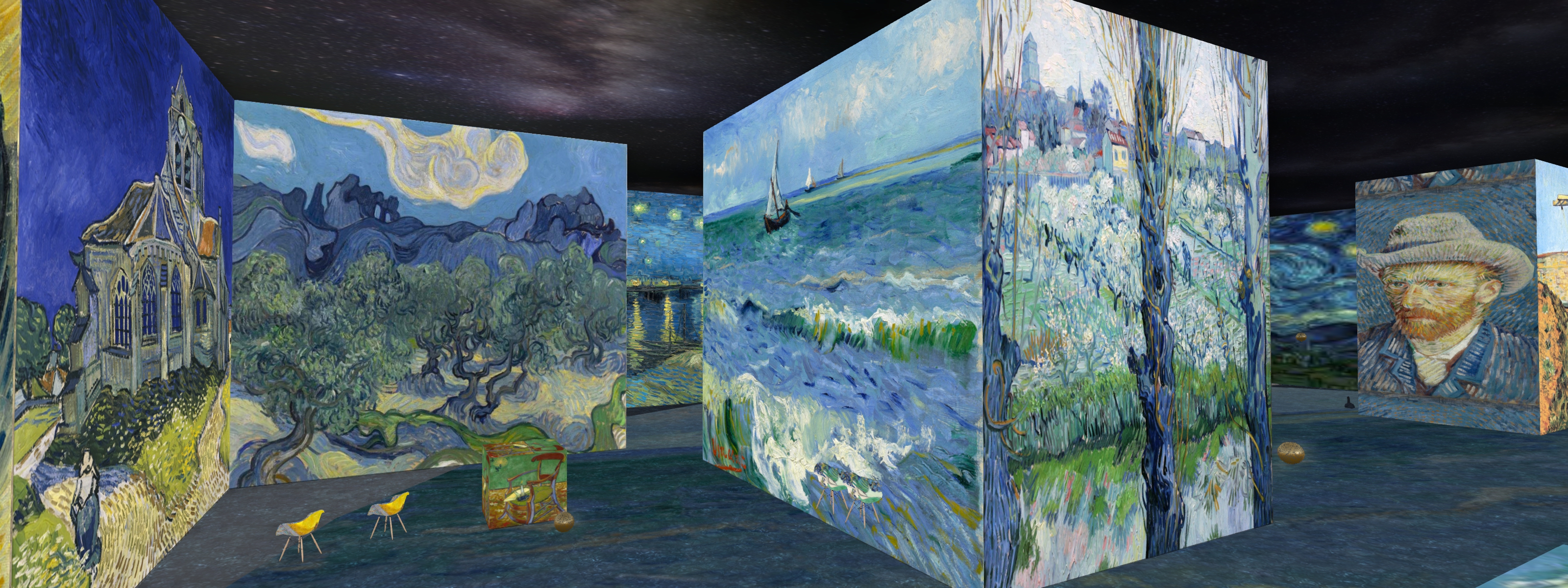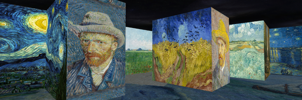 This is at first appears to be a most unusual exhibition, in that the gallery space is given over to large cubes, on four faces of which are reproductions of many of van Gogh’s paintings, while the inner walls of the gallery space carry a repeated reproduction of his 1888 painting, Starry Night Over The Rhone.