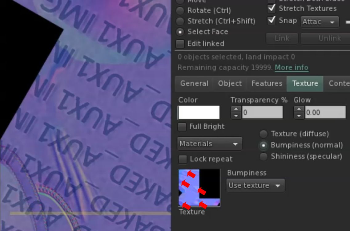Following the April 11th CCUG, Cathy Foil carried out further tests to apply materials to a Bakes of Mesh surface. This involves using a script to take the UUID for one of the new universal bake channels (e.g.BAKED_ AUX1), and pointing it to a normal map (shown in the place holder normal map image “BAKED AUX1 IMG”, right), then wearing a universal wearable that uses the same bake channel. This results in the normal map then being applied to the desired face, as show in the image of the normal map in the Edit floater (arrowed on the right, above). This approach also appeared to allow a layering of normals on a face. However, the method is not currently seen as a recommended approach to materials with BoM, and probably won’t be treated as a supported technique.