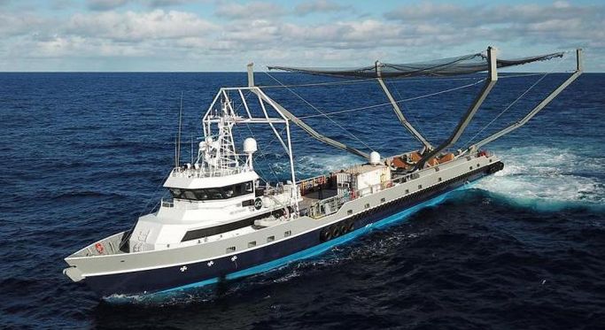 Sea trials: the 62 m (205 ft) long Go Ms. Tree (formerly Mr. Steven), leased by SpaceX and converted to “catch” payload fairings in the huge net suspended over the stern deck, made its first successful catch with the STP-2 mission. Credit: Teslarati / SpaceX / Sea Tran