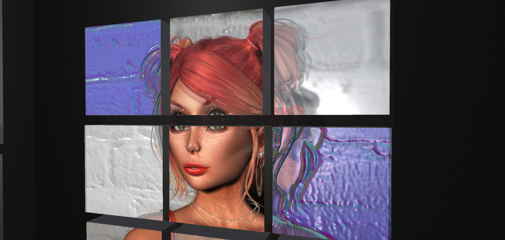 Myra Wildmist, meanwhile offers an experimental piece entitled Material Girl. You’ll need to have your viewer’s Advanced Lighting Model (ALM) enabled via Preferences > Graphics to see this piece correctly, as the nine tiles use various normal (bump) and specular (shine) maps to produce different finishes to the piece.