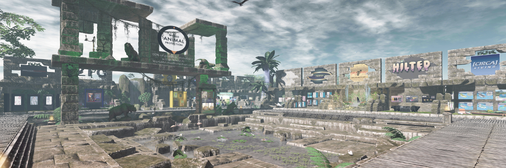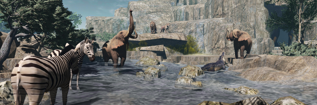 Of course, one might argue that the presence of African elephants might be excused by the fact that Asian elephants are in short supply in SL – but what then of the hippos with their slightly oversized tusks occupying the water by the second of the two little islands? They perhaps more directly throw a suggestion of Africa into the mix, contrasting strongly with the south seas idea, while the tigers roaming the island behind them further stirring the mix.