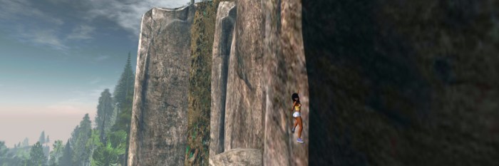 The direct route is just that – straight up the cliff, using a natural fold in the rock, just as a real climber would. I admit to having a little trouble at the top of this – the climb animation refused to release, so I’d reach the top, fall back a couple of metres and resume climbing, reach the top, fall back… A double-click TP resolved this.