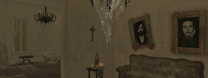 This latter aspect is shown through the use of elements such as the candles (a clear symbol associated with death) and the path they mark (representing the path we follow through life to its eventual end, which is in turn symbolised by the tomb), and by the house. The latter (perhaps best explored after hearing the poem throughout), shows signs of past habitation with rooms and furniture slowly mouldering. However, these are themselves more broadly representative of the memories of love and life shared but which have come to an end; the memories we fight to hold on to after the passing of a loved one, but which inevitably age and fade with the passing of time.