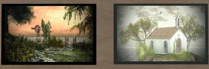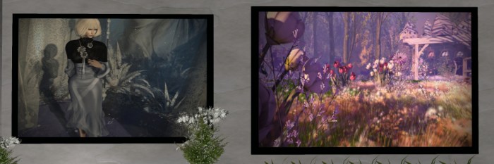 A further attractiveness with this exhibition is the dressing Jamee has given the gallery space around her work: fantasy settings fronted by night flowers that seem to offer a way into the images; the accoutrements of a beach location accompanying her coastal and water images; ivy hanging from walls to bring together images of ruins and horses to form a vignette of their own. Among these elements are a series of small photos of Jamee and her SL companion, Matt Thomson; these add a further personal dimension to the exhibition that is delightful to see.