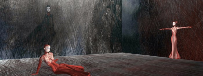 The Animesh models give a physical dimension to the atmosphere of anxiety, looming anger, anguish and hurt through their pacing, head movements, and through their shape. The exaggerated points of the male figure’s shoulders convey a sense of hunch-shouldered annoyance as he strides in his place, for example.