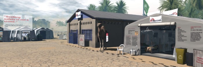 Thus, the landing point offers visitors an opportunity to look inside a typical refugee camp and witness the work that MSF carries out, from triaging injuries and illnesses to working the logistics of food, drinking water and other essential supplies to providing shelter. Information boards throughout outline the work and offer insight into MSF’s multi-faceted work. Yes, the setting may desert, but it could also so easily be the grasslands of Africa, the forests of South America – or any of the multitude of places around the globe where refugees are attempting to seek help and support; as such I do recommend that rather than hopping straight on to the teleport boards and going shopping, people spend a few minutes within the camp.