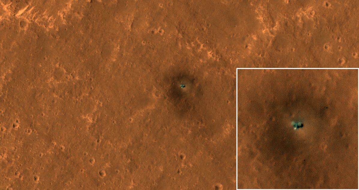 The main image above shows the lander on the surface of Mars surrounded by the blast circle left by its landing motors. The inset image shows the lander in greater detail, revealing its two circular solar panels, each just over 2 m (7 ft) across (in green), with the body of the lander between them (brighter green). The bright dot just below the lander is the protective dome covering the seismometer deployed to the surface of Mars along with the HP³ mentioned above. Also visible in the main image is a series of diagonal streaks on the Martian surface. These are the tracks left by dust devils that have passing through the area.