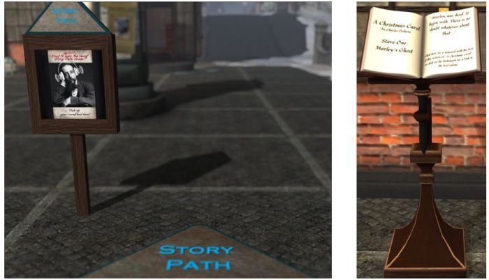 The Story Path Voices Audio Tour: collect your free HUD from the kiosk at the landing point and ADD it (it will wear invisibly and operate automatically), then follow the Story Path markers through the region (including into and out of some of the buildings) at normal walking pace to hear over 40 selected voice clips from A Christmas Carol, as well as music and sound effects as you step over the markers.