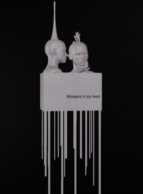 The commentary on modern life can be found threaded throughout the installation within pieces such as Evolution, with it’s very clear Apple Inc., reference, Nothing Is All White and Inner Mechanism. Sometimes, as with these pieces, the reference is clear; elsewhere it is more subtle – such as with In A Bar, where the emptiness of the bar setting references the lack of genuine socialising modern life encourages.