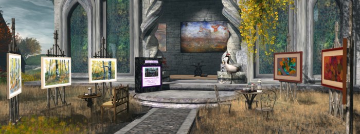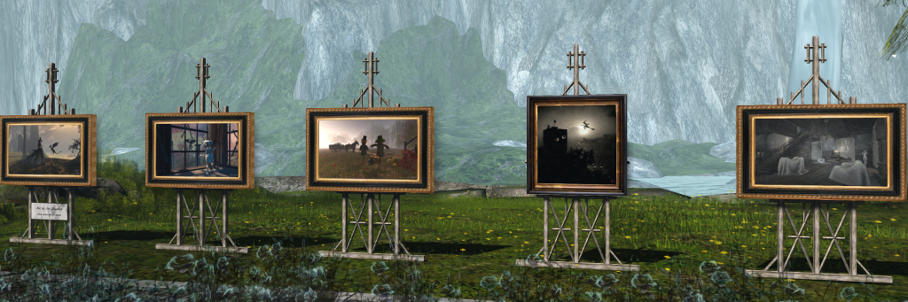 Misty Glen Gallery: Carlotta Caewlin, Sophie Dunn, Mireille Jenvieve, Larke Longmeadow and Liam Saxony, together with a machinina by Terra Merhyem. Click the board outside the gallery space to obtain note card with the URL to the video on Vimeo.