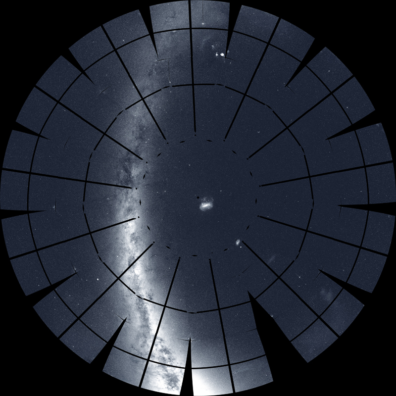 To the left of the mosaic is the bright band of the milky way, the most densely populated (in terms of stars) part of our own galaxy. Centred within the image is the Large Magellanic Cloud (LMC), one of our galaxy’s closest neighbours. Below and to the right of this, just off-centre is another galaxy, the Small Magellanic Cloud (SMC), with the globular cluster of stars within our galaxy called NGC 104 appearing as a bright spot close to it.