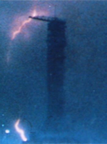 Having struck the Saturn V 36.5 second after the launch of Apollo 12, lightning travelled down through the vehicle and through its ionised exhaust plume to discharge on the launch pad gantry. Credit: NASA