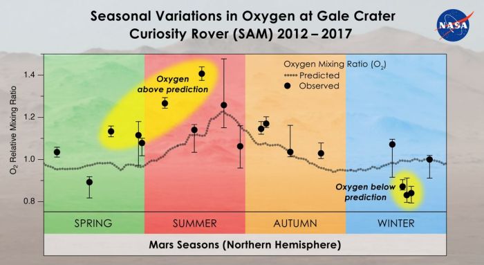 It took time to verify SAM’s findings, as planetary scientists wanted to be certain the instrument wasn’t giving false results, or that the additional oxygen wasn’t the result of some kind of reaction as a result of a breakdown of either CO2 or atmospheric water vapour. However, no fault was found in the instruments within SAM, and calculations showed that it would take five times the measured amounts of water vapour in the atmosphere to produce the additional oxygen, while CO2 breaks down far too slowly to result in such rapid seasonal fluctuations.