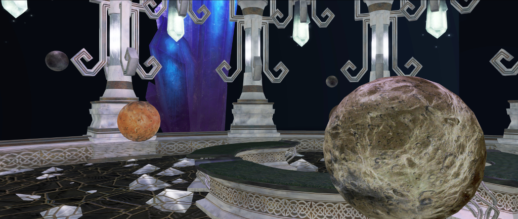 Within a structure built by Elicio Ember, lie four small moons / planets, all orbiting a central sphere. Together, these five orbs form a set of musical emitters, the sound from the lower four constantly shifting aurally as you sit on the benches below them. Between the benches and the upper spheres are four larger, interactive orbs (three of which have a passing resemblance to the Jovian moons Io, Ganymede and Callisto respectively, and the fourth to Mercury), also circling a central point while rotating slowly about their own axes. As Lorin then explains: