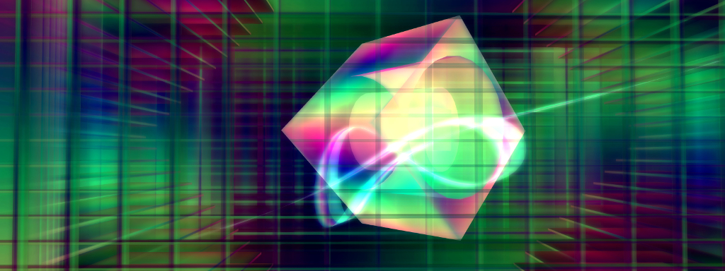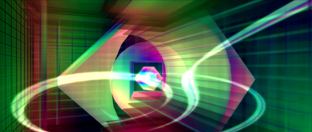 Describing this piece isn’t easy; perhaps the best means of doing so is to refer to it as a coloured mobile of geometric forms set within a rainbow grid and turning slowly, it’s motion seemingly driven by the the gentle tones and vibrations of the music.