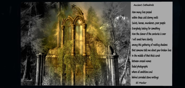 Currently open at Sisi Biedermann’s Gallery and Garden, where it will remain through most of January, is an exhibition of art and words by the Second Life partnership of Ladmilla and Eli Medier, who between them also curate and manage THE EDGE Gallery.