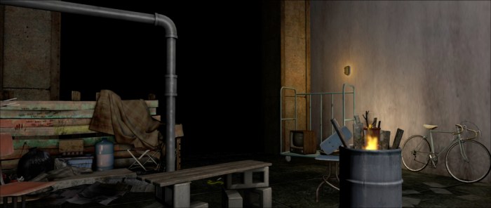 The story is set out in a series of descending rooms, starting from the uppermost, where a general introduction to the installation can be found, together with information on how best to view the installation. Spiralling downwards, each room offers a piece of the story, the physical descent from room to room clearly a metaphor for the descent into the darkness of substance abuse / dependency. Following the path down can be a little difficult in places, – so just cam around if you feel your are stuck; there are clues in places – green triangles on the floor or roses spread across them.