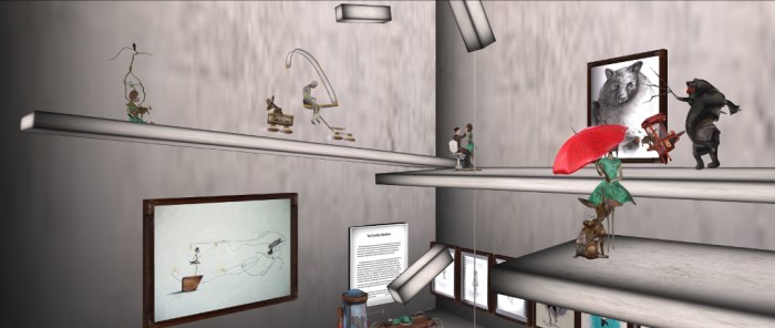 Spread over two level of the gallery (accessed via the teleport point in the foyer area), the exhibition presents a series of sketches showing the evolution of The Daughter of Gears, mesh models from various scenes from the trilogy (including some that do not appear to have been used in the final installations), and drawings that appear to show the evolution of the rabbicorn as well asstory scene ideas.