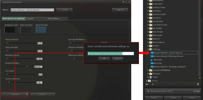 - You can now edit the imported windlight, if required and then use Save As from the drop-down as the bottom of the edit floater to save it as a new (and modified) asset in your Inventory.