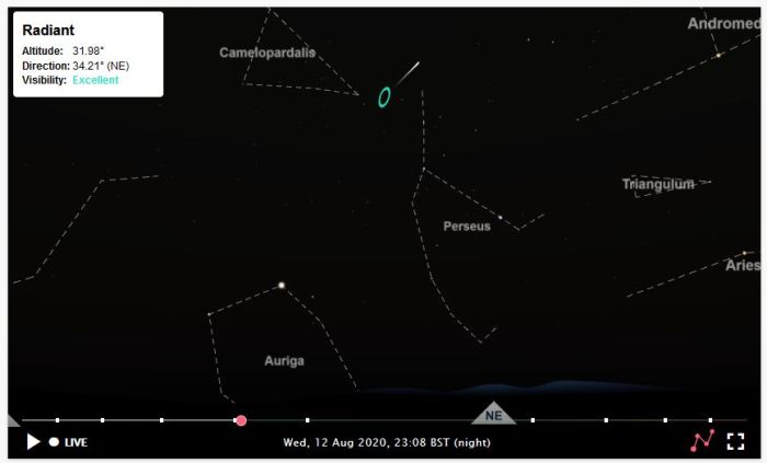 As the Moon is in its last quarter phase only rising at around 01:00 local time some 42º from the shower’s radiant (apparent point of origin in the night sky), which sits in the north-east sky between Camelopardalis and Perseus (the constellation from which they take their name), “seeing” opportunities should be reasonably good, assuming clear skies for those of us in Europe and North America.