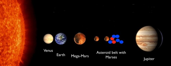 - Why is the asteroid belt so relatively uniform? Again, if Jupiter formed 5-5.5 AU from the Sun, then the material within the accretion disk should have resulted not only in a Earth-size Mars, or a possible “mega Mars”, but should also have resulted in the formation of many more planetismals or “mini Marses” forming, smaller than Mars as weknow it today, but potentially somewhat larger than the likes of Vista and Ceres within the asteroid belt.