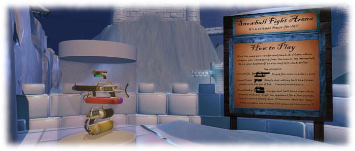 Winter Wonderland can be reached via either Portal Park 1 or Portal Park 2, or via direct teleport to the landing point. Just walk through the village on arrival and follow the path up over the hills. Kiosks at the entrance to the arena are available for obtaining your weapons, including a Premium-only Snowzooka.