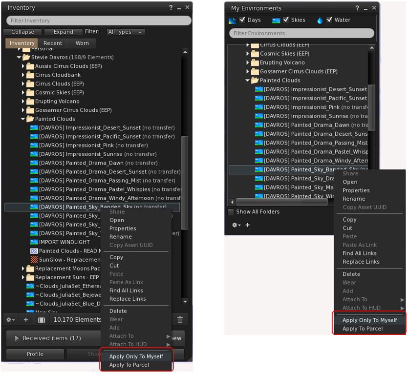 The easiest way to use these assets is to apply them directly to your avatar – highlight the asset you wish to use the right-click on it and select Apply only To Myself. This can be done from inventory or from World → Environment → My Environments … Applied in this way, the setting you’ve selected is only visible within your viewer, and will not be seen by others.