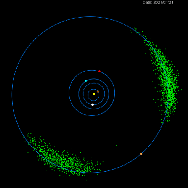 These are the Jovian Trojan asteroids, the “leftovers” from the creation of the solar system. They orbit the Sun in two large clouds, one group, called the Greek Camp, leading Jupiter in its path around the Sun and that Jupiter-Sun L4 position, the other – the Trojan Camp – trailing behind the planet at the Jupiter-Sun L5 position.