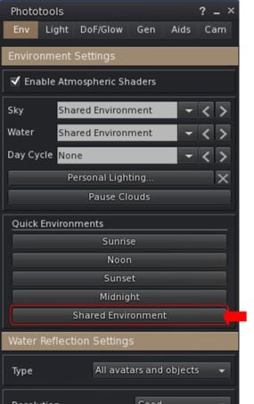 A minor, but nevertheless issue with Phototools since the introduction of the Environmental Enhancement Project (EEP) capabilities into Firestorm has been the fact that the Shared Environment button (Phototools → Env) has never been properly hooked-up to the EEP controls.