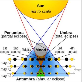 There are a number of terms common to eclipses which are worth mentioning for those who wish to follow the event, but are unfamiliar with the terminology. Specifically for a total eclipse these are: